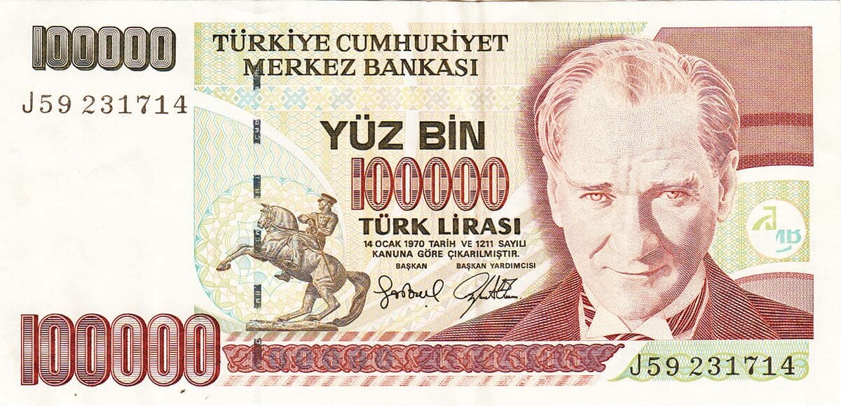 Турецкая лира, состоящая из 100 курушей, стала официальной валютой страны в 1923 г. — год основания республики, заменив османскую лиру. В результате высокой инфляции конца XX — начала XXI века лира сильно обесценилась. 1 января 2005 г., была введена новая турецкая лира, которая заменила старую по курсу 1 : 1000000. С 1 января 2006 г. все монеты и банкноты, относящиеся к первой лире, вышли из обращения, а с 1 января 2009 года приставка «новая» в названии валюты официально не используется. Размер банкноты 158×76 мм. Основные цвета купюры - оттенки коричневого и зелено-оливкового с многоцветными деталями. В качестве средств защиты водяной знак с портретом Мустафы Кемаля Ататюрка (1881— 1938), вертикальная прерывистая полоса с аббревиатурой ТСМВ, светящиеся в ультрафиолете частицы. В верхнем левом углу цифровое обозначение номинала "10 000", повторяющееся в нижней части банкноты шрифтом большего размера и другого цвета. Под ним находится серийный номер, который повторяется в правом нижнем