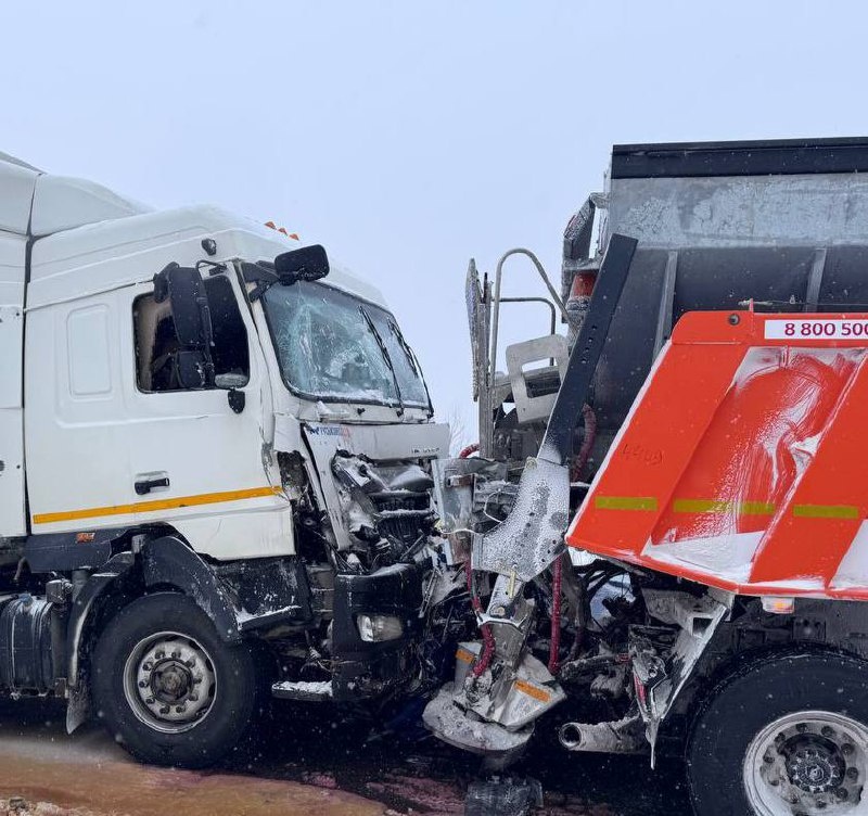 Все началось с «Фольксвагена»: на трассе Тюмень — ХМАО он влетел в снегоуборочную машину. Легковушку зажало между спецтехникой и отбойником — водитель и пассажиры чудом остались живы, но получили тяжелые травмы. Спустя время в ту же технику врезалась «Киа», а в нее влетел огромный «МАЗ». От удара иномарку расплющило между грузовиками. Позже в большегруз въехала еще и «Мазда». Предварительно, все трое из «Киа» погибли на месте. Фото: Госавтоинспекция Тюменской области