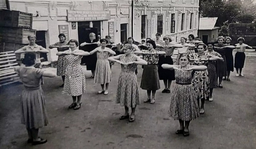 Есть ещё кадры из разных регионов (вплоть до 1940-х), где видно: физкультура была распространена широко. И это, пожалуй, один из тех «плюсов системы», который на фото считывается без объяснений: девчонки в разных концах огромной страны делают одни и те же упражнения — и выглядят одинаково живыми.
