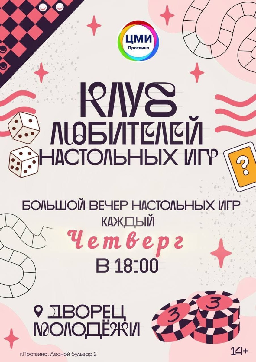 ✨ Играем в настольные игры в Протвино по четвергам 🎲 ☀️Ждём каждый четверг в 18:00 ✍️Мы собираем дружную компанию любителей и новичков, чтобы сразиться в хитроумные стратегии, веселые викторины и эпические приключения! У нас есть игры на любой вкус: от классики до самых новых хитов. 🚫 Возраст: 14+ 🏢 Центр молодежных инициатив 📍 г.о. Серпухов, г. Протвино, Лесной бульвар, 2 💰 Вход свободный❗️ ⭐Поддержать канал голосом 💰 Канал Вакансии Серпухова ✅ Мероприятия Серпухов https://dzen.ru/id/66f01c6eb4c6fe60c9ca1608 https://vk.ru/serpukhov_events http://dzen.ru/serpukhov_events