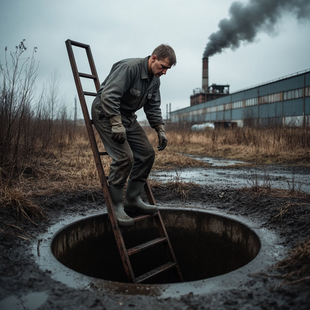 В конце августа на одном из участков прорвало старую магистраль. Вода хлынула в тоннель, затопив половину коммуникаций. Бригаде дали срочное задание — спуститься и устранить течь. Пошли двое: Лёша и его напарник Гриша. Гриша остался у входа с инструментами, а Лёша полез вглубь, где уровень воды доходил до пояса. Фонарь мигал, воздух был тяжёлым, пахло гнилью и металлом.