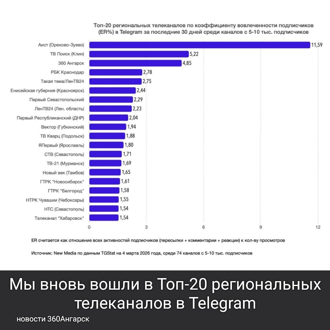 »! 📢 📈🏆С радостью сообщаем, что мы вновь вошли в Топ-20 региональных телеканалов в ТЕЛЕГРАМ за последние 30 дней среди каналов с 5-10K подписчиков! Мы заняли 3 место по коэффициенту вовлечённости подписчиков, и это стало возможным благодаря вам! 🥰 Также мы вошли в ТОП по суммарному охвату за февраль, который составил более миллиона зрителей! 🚀🔝 Ваш интерес и поддержка вдохновляют нас работать ещё лучше. 😘💪 🔥Мы стоим на страже актуальных новостей и всегда готовы помочь придать огласке события, которые волнуют наш город. Спасибо, что остаетесь с нами! 📲 Мы в MAX, подпишитесь!