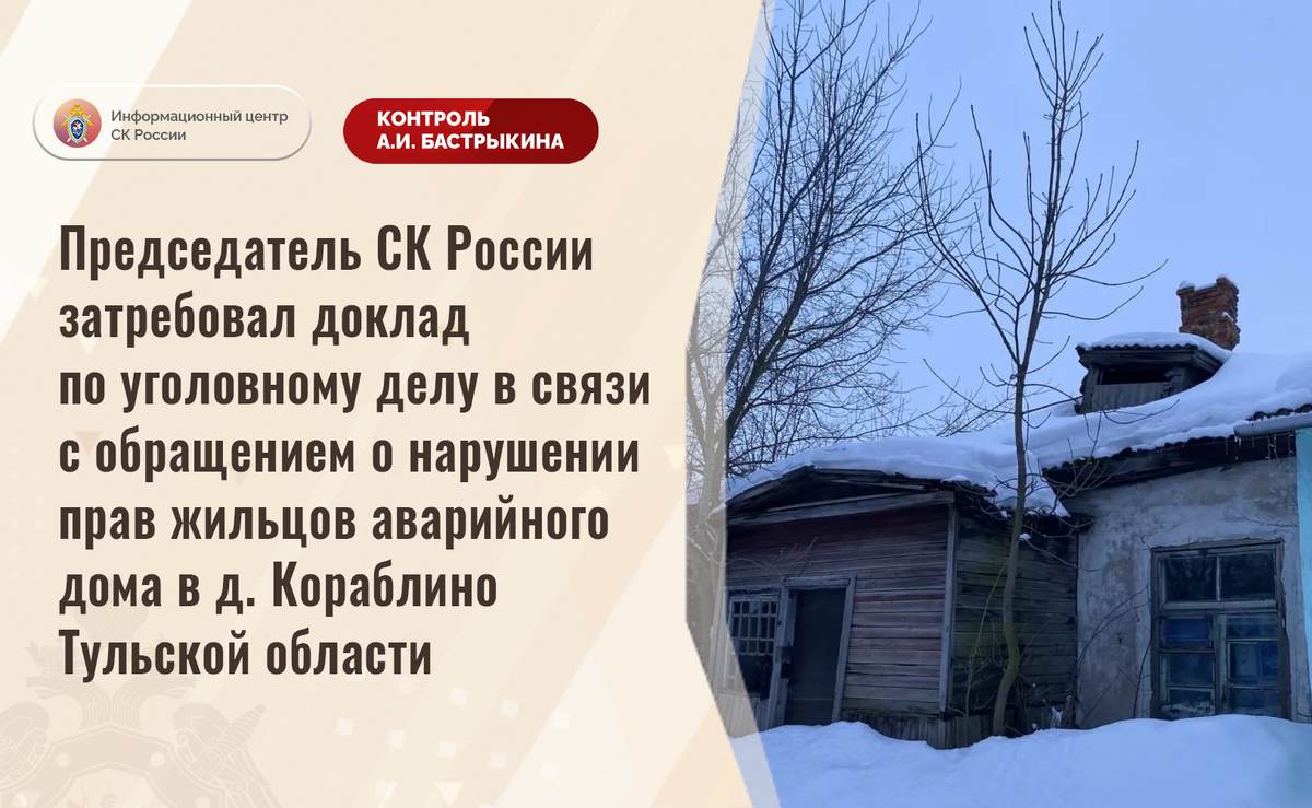 Председатель СК России затребовал доклад по уголовному делу в связи с обращением о нарушении прав жильцов аварийного дома в д. Кораблино Тульской области В приёмную Председателя СК России А.И. Бастрыкина в социальной сети «ВКонтакте» поступило обращение по вопросу нерасселения жильцов многоквартирного дома в деревне Кораблино Тульской области. Кровля здания 1966 года постройки разрушается, в стенах образовались трещины. В 2017 году строение ввиду высокой степени физического износа конструкций признано аварийным, однако до настоящего времени благоустроенное жилье гражданам взамен не предоставлено, о сроках расселения они не уведомляются. Заявительнице предложен переезд в общежитие, находящееся в непригодном состоянии, с чем она не согласна. Обращения в компетентные органы результатов не принесли. В СУ СК России по Тульской области возбуждено уголовное дело. Председатель Следственного комитета Российской Федерации Александр Иванович Бастрыкин затребовал у руководителя СУ СК России по Ту