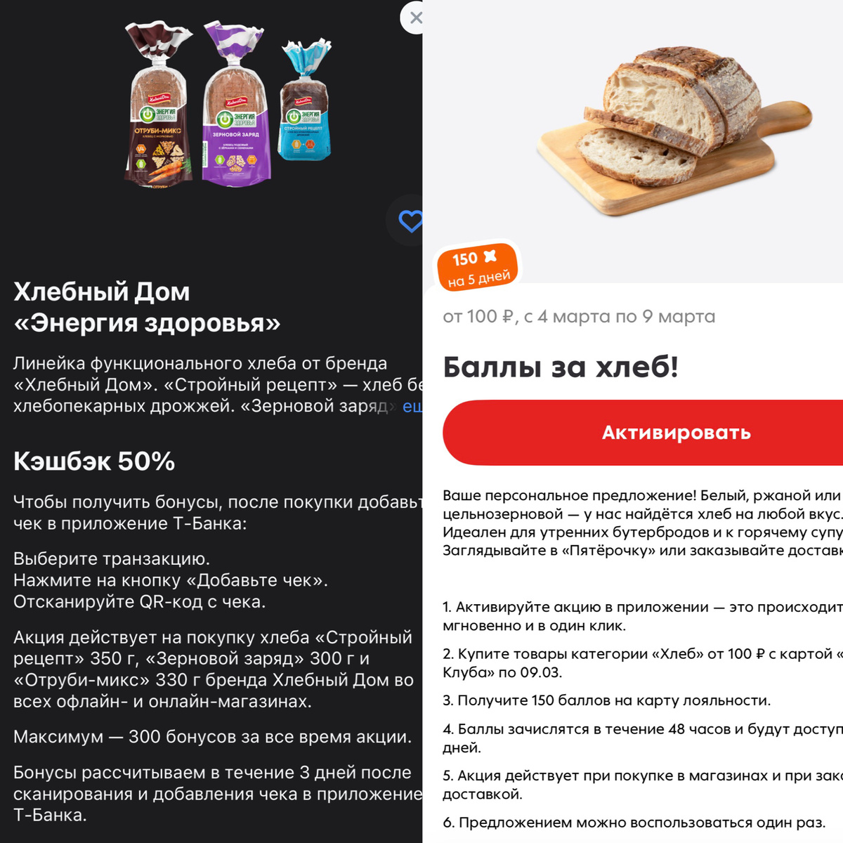 1.Смотрим есть ли у вас в Т-банке в разделе «кешбэк у партнёров» -50% на хлеб и покупаем его в «Пятёрочке», активируя баннер в приложении. Получаем двойную выгоду. Не забываем чек загрузить в Т-банк (операции - прикрепить чек).