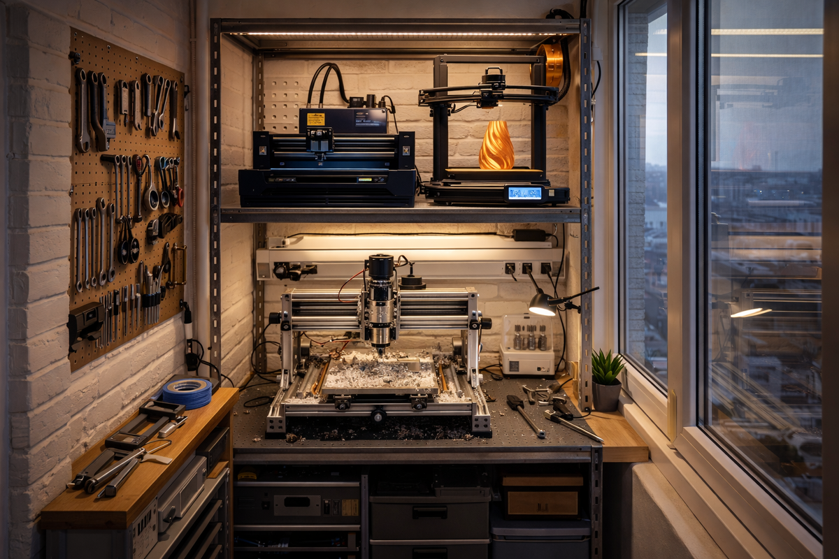 Приветствую всех, кто болен созиданием! Если вы читаете это, значит, вам знакома одна очень специфическая боль. В голове роятся грандиозные проекты, руки чешутся вырезать, гравировать и печатать, но суровая реальность бьет по рукам квадратными метрами. Не у всех нас есть теплый гараж на две машины или просторный ангар за городом. Чаще всего в нашем распоряжении оказывается утепленная лоджия, бывшая кладовка или просто угол в комнате. Те самые пресловутые три-четыре квадратных метра.
