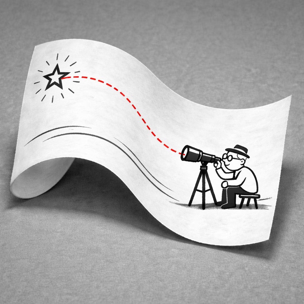 Представим двумерный мир на листе бумаги. И там есть двумерный свет, который движется от двумерных звезд в направлении двумерных телескопов двумерных ученых. И теперь скажите, эти ученые увидят какие-либо изменения в движении света, если мы, трехмерные боги, изогнем лист? Или сделаем на нем вмятину или скрутим в бараний рог?