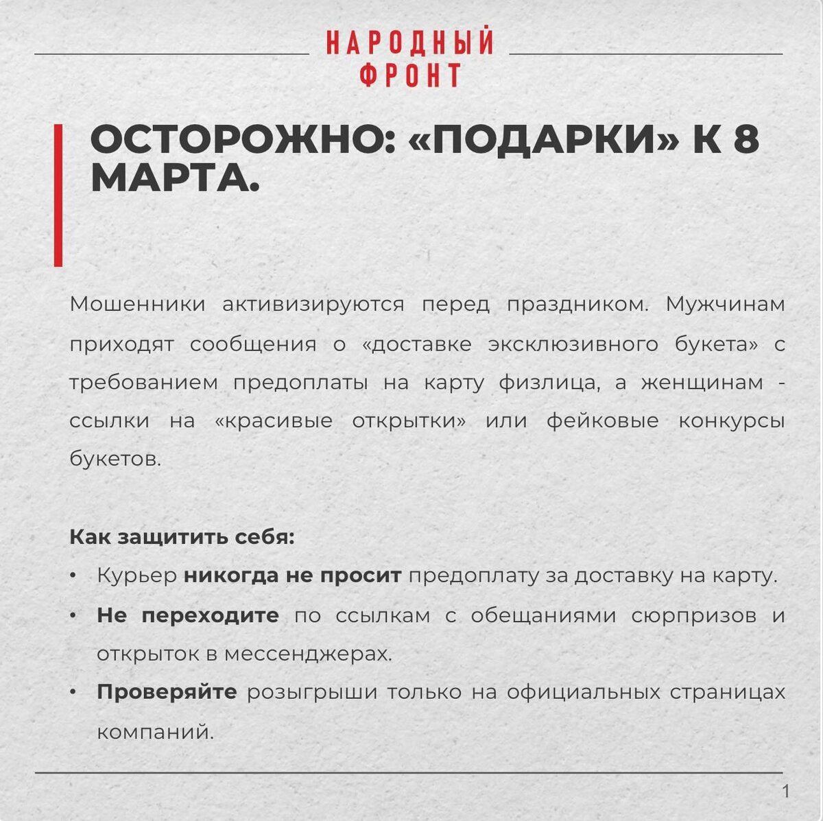 Приближаются праздники – 8 Марта, а затем и майские. Время, когда мы начинаем откладывать деньги на подарки и поездки, может обернуться неприятным сюрпризом: ваши сбережения рискуют оказаться в руках аферистов. Только за последнюю неделю обманщики выманили у граждан свыше миллиона рублей. Чтобы уберечь вас от мошеннических схем, проект "Мошеловка.РФ" от Народного фронта подготовил информационные карточки. В них мы подробно разбираем новые уловки мошенников, которые могут появиться в марте, и на которые стоит быть особенно внимательными. Поделитесь этой информацией с друзьями, чтобы как можно больше людей знали, как защитить себя от мошенников. Берегите себя и свои деньги!