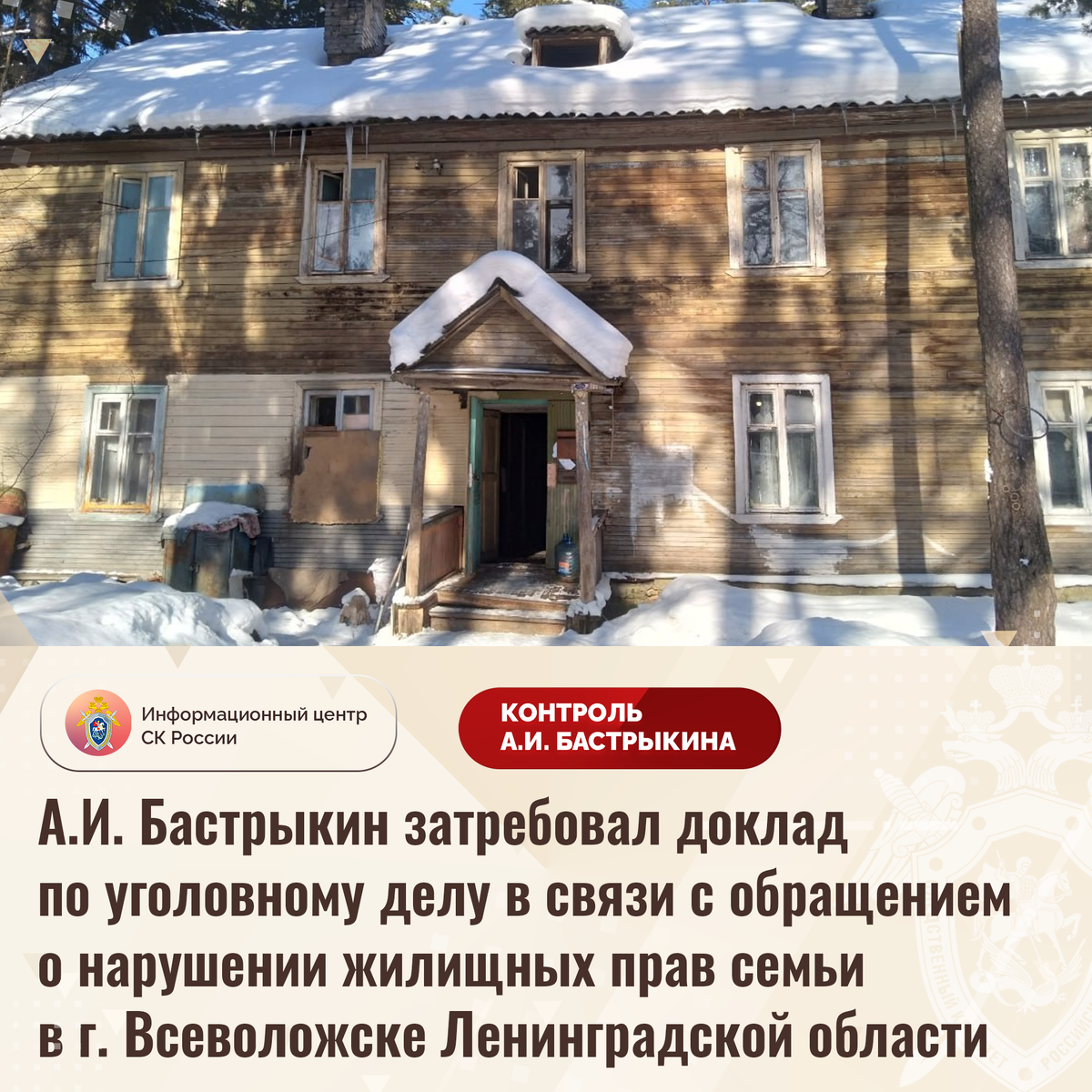 А.И. Бастрыкин затребовал доклад по уголовному делу в связи с обращением о нарушении жилищных прав семьи в г. Всеволожске Ленинградской области В приёмную Председателя СК России А.И. Бастрыкина в социальной сети «ВКонтакте» обратилась жительница города Всеволожска Ленинградской области по вопросу нарушения жилищных прав ее семьи. Женщина с двумя несовершеннолетними детьми проживает в многоквартирном доме барачного типа 1964 года постройки на проспекте Алексеевском, который находится в непригодном состоянии: кровля протекает, печное оборудование и конструкции разрушаются, водоснабжение осуществляется с перебоями. В 2021 году ввиду высокой степени физического износа строение признано аварийным, однако до настоящего времени семье благоустроенное жилье взамен не предоставлено. Обращения в компетентные органы результатов не принесли. В СУ СК России по Ленинградской области возбуждено уголовное дело. Председатель Следственного комитета Российской Федерации Александр Иванович Бастрыкин затре