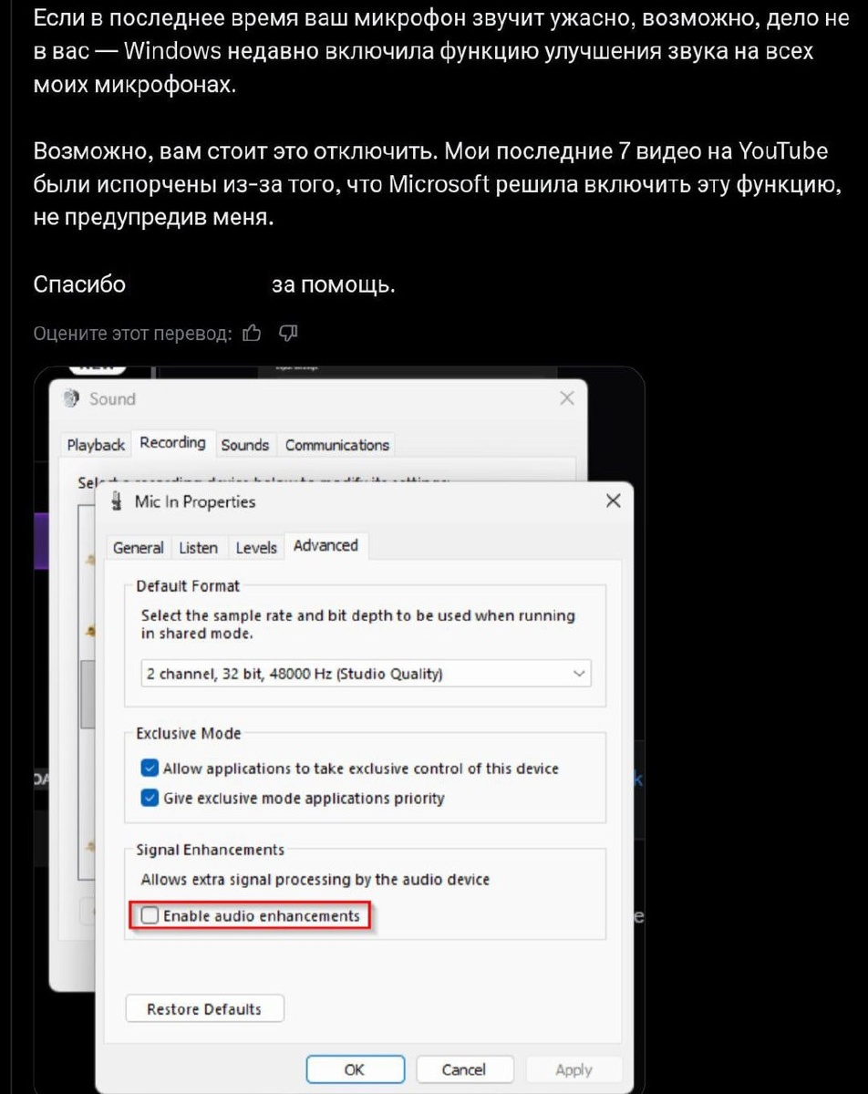 В компании умудрилась сломать даже микро обновление полностью сносит пользовательские настройки и включает «улучшение звука», превращающее качество в шуршащий фантик. Как исправить: ПКМ по значку звука → Параметры звука; Все звуковые устройства → выбираем микрофон; Выключаем «Улучшение звука»; Дополнительные параметры звука → Запись → Микрофон → Дополнительно; Убираем дополнительные улучшения и перезагружаем ПК. Маленькая инди-компания, понимать надо. CtrlAltDelights- подписаться
