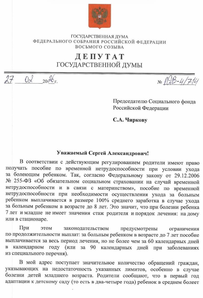 👇 А в случае, если ребенок младше 5 лет, до 120 дней при особых заболеваниях. 📩 Направила такое письмо председателю Социального фонда РФ Сергею Чиркову. Сейчас пособие по временной нетрудоспособности при уходе за ребенком до 8 лет выплачивается в размере 100% среднего заработка. При этом оплачиваются не более 60 календарных дней в году, а при заболеваниях из специального перечня - до 90 дней. Ко мне поступают обращения граждан о том, что установленного лимита часто не хватает, особенно если ребенок младшего возраста часто болеет. После исчерпания лимита дальнейший уход за ребенком не оплачивается, что может сказаться на финансовом положении семьи. Данная мера позволит семьям пережить сложный период болезни маленького ребенка без страха потерять средства к существованию, а также сохранить прежний уровень жизни, при этом не жертвуя надлежащим уходом за ребенком. #Инициатива