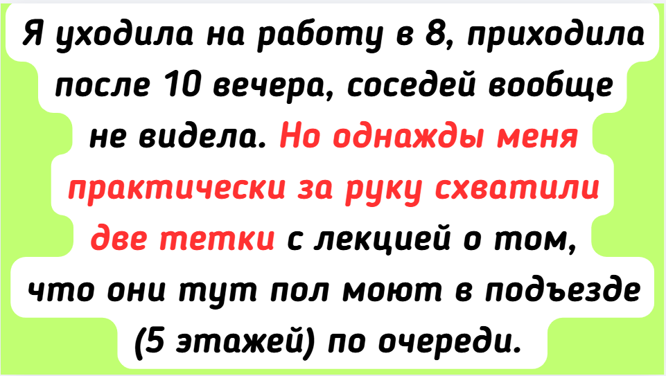 - Я уходила на работу в 8, приходила после 10 вечера, соседей вообще не видела. Но однажды меня практически за руку схватили две тетки с лекцией о том, что они тут пол моют в подъезде (5 этажей) по очереди. На мои возражения, что мы платим уборщице, они заявили: «А нам не хватает ее уборки». Регион, к слову, довольно чистый, снег неделю в году, слякоть редко. Ничего, пожала плечами и предложила им продолжать развлекаться, как им захочется. Больше меня не трогали. © Алина / ADME