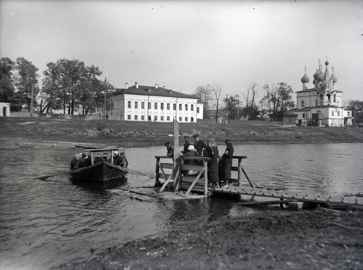 На снимке 1950-х годов лодочная переправа у Соборной горки. Если порассматривать фотографию, то рядом с церковью Иоанна Златоуста можно увидеть небольшой домик. Его фундамент до сих пор выглядывает из земли в том месте.