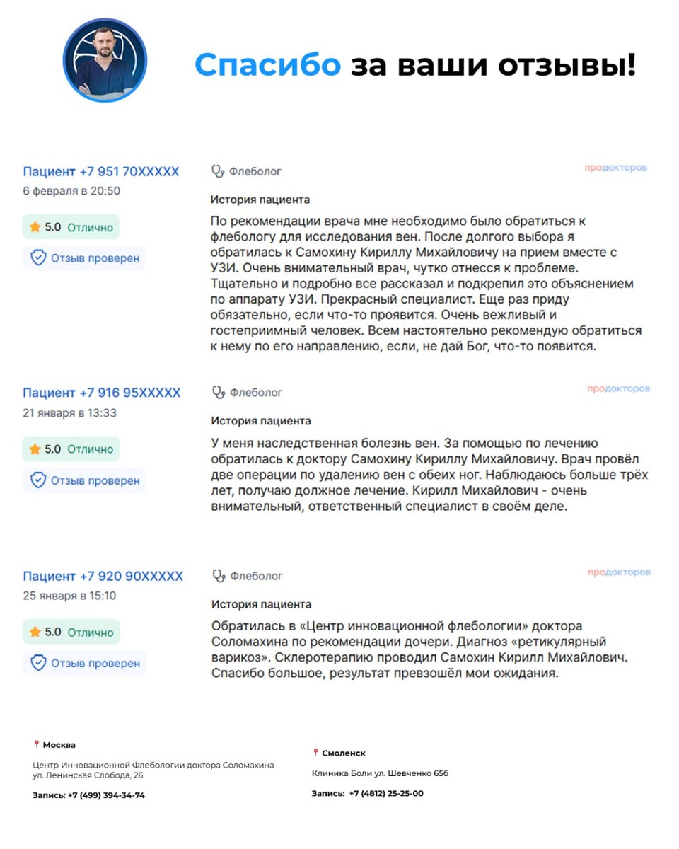 ! 💙 Каждое такое сообщение — это не просто оценка нашей работы. Это подтверждение, что мы делаем всё правильно. Когда вы пишете, что после операции исчезла боль, что ноги стали выглядеть лучше, что вы снова можете жить полной жизнью — это самая лучшая награда для врача. Я благодарен каждому, кто доверил мне своё здоровье. И особенно тем, кто нашёл время рассказать о своём опыте другим людям. Ваши отзывы помогают тем, кто ещё сомневается, кто боится, кто откладывает лечение. Вы даёте им надежду и уверенность. Спасибо вам! ❤️ — Кирилл Самохин Главный врач, ССХ, флеболог Центра Инновационной Флебологии доктора Соломахина, Москва Страница ВК: vk.com/dr.samokhin 📍 Москва Центр Инновационной Флебологии доктора Соломахина ул. Ленинская Слобода, 26 | +7 (499) 394-34-74 📍 Смоленск Клиника Боли, ул. Шевченко, 65б | +7 (4812) 25-25-00