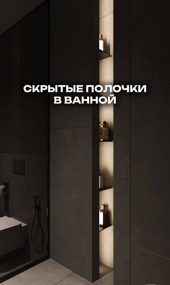 Вас тоже раздражает, когда вокруг ванны стоят десятки шампуней, гелей и баночек? 😩 Всё это портит вид, создаёт ощущение беспорядка и просто мешает расслабиться. Особенно если ванная комната сделана в современном стиле. Дизайнер Родион Давыдов предложил простое и очень изящное решение — скрытые полочки прямо в стене 🙌 Представьте: большая отдельно стоящая ванна 🛁, рядом зона душа 🚿 Пространство открытое, лёгкое, ничего лишнего. И главный вопрос — где хранить все средства? 🤔 Ответ — в нишах, которые аккуратно встроены в стену и облицованы той же плиткой. Мастер делает углубление в стене, инкрустирует его плиткой так, что всё выглядит как единое целое ✨ Полка словно растворяется в интерьере. Никаких металлических уголков, никаких пластиковых подставок — только чистая геометрия и стиль 😍 А чтобы добавить уюта, в нишах можно сделать мягкую подсветку 💡 Свет создаёт красивый глубинный эффект. Вечером такая ванная превращается в настоящее спа-пространство 🕯 Всё нужное под рукой, но нич