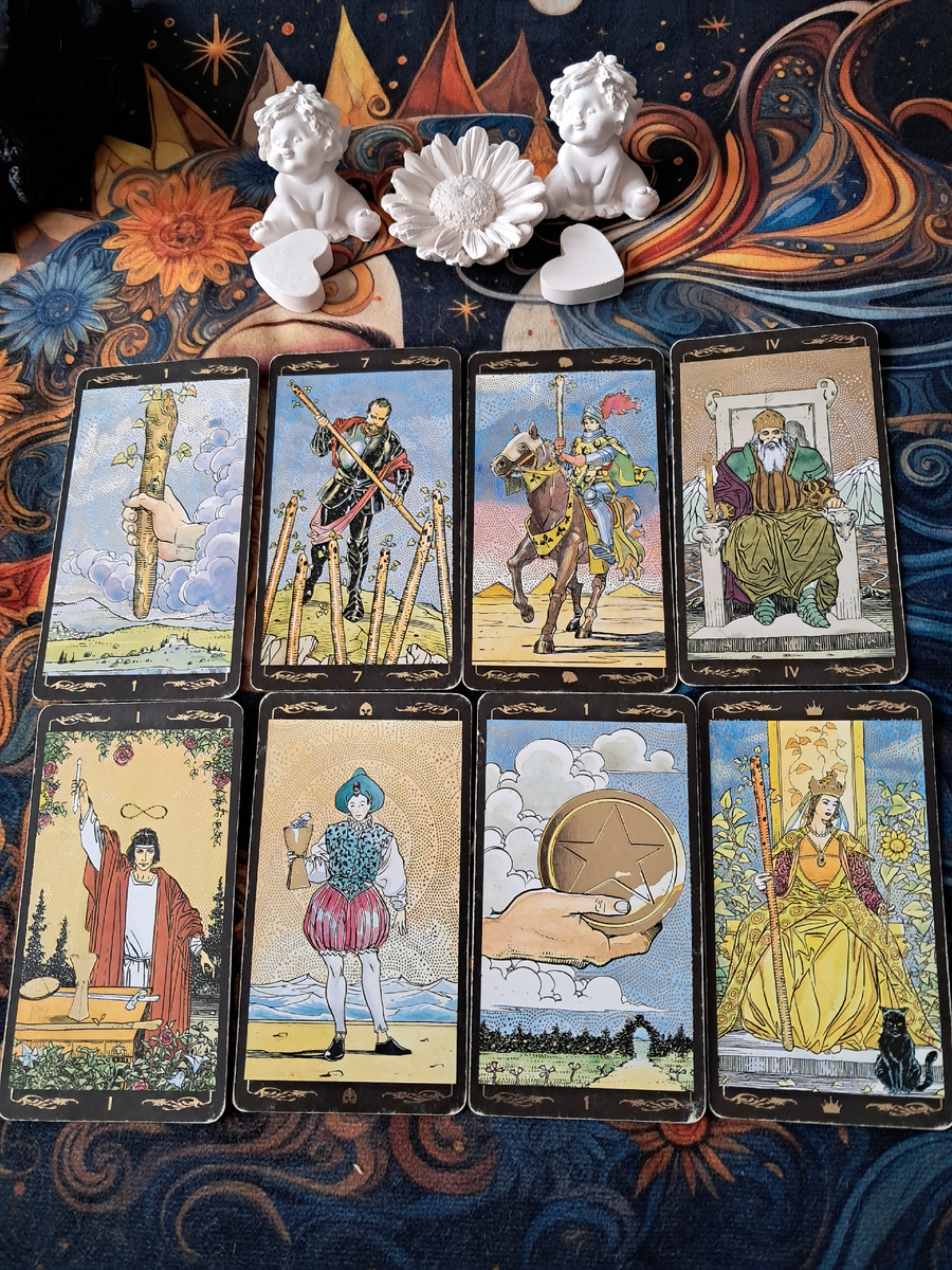 Его переполняет энергия действия. Туз, 7 и Рыцарь Жезлов говорят о том, что он находится на пике своей мужской силы. Он больше не хочет ждать или сомневаться — он готов к рывку, к завоеванию, к активным действиям. Маг в центре расклада подтверждает: у него есть все ресурсы, чтобы реализовать задуманное. Паж Кубков смягчает эту огненность, добавляя искренние чувства и романтический интерес, а Туз Пентаклей обещает, что его шаг будет направлен на создание прочного, материального фундамента.