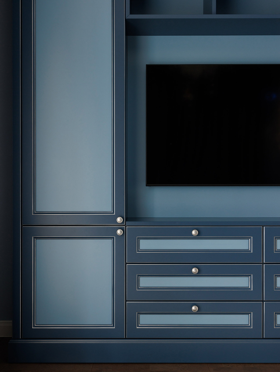 Если присмотреться к деталям, становится понятно, за счёт чего этот шкаф выглядит объёмным и глубоким. Патина здесь — не просто декоративный штрих. Она подчёркивает профиль фасадов, усиливает игру света по кромке и визуально добавляет рельефа. Благодаря этому даже плоскость приобретает архитектурную выразительность — появляется ощущение глубины и многослойности. При этом многое остаётся незаметным на первый взгляд. Чёткие, выверенные зазоры между фасадами, идеальное выравнивание по горизонтали и вертикали — это результат точной сборки и контроля на производстве. Внутри — надёжная фурнитура, рассчитанная на ежедневную нагрузку и работу во времени. И, конечно, за внешней симметрией стоит работа проектировщика. Продуманные сценарии хранения, распределение ящиков и секций, баланс между закрытыми объёмами и центральной нишей под телевизор — всё это формирует не просто красивую композицию, а удобную, функциональную систему для жизни. Фото: Иван Сорокин