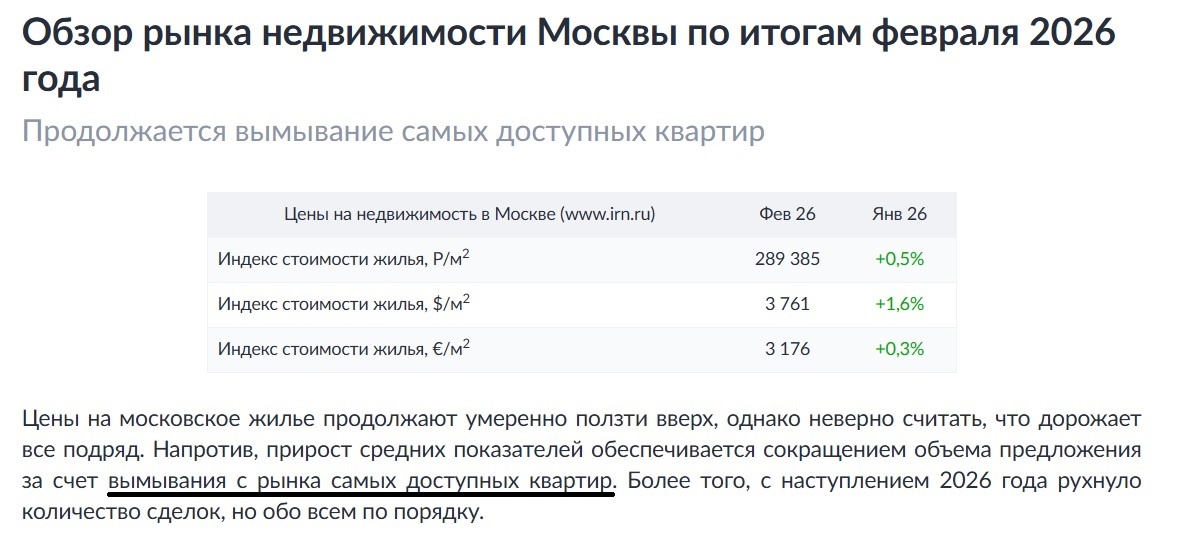 Главный итог февраля — столица демонстрирует агрессивную устойчивость к любым макроэкономическим ветрам. В то время как "перегретые" льготной ипотекой рынки остывают, Москва продолжает пылесосить капитал. Это не спекулятивный отскок, а фундаментальный приток денег, которые ищут "тихую гавань" внутри страны. Подтверждением служат не только цены на жилье, но и рынок земли..."
