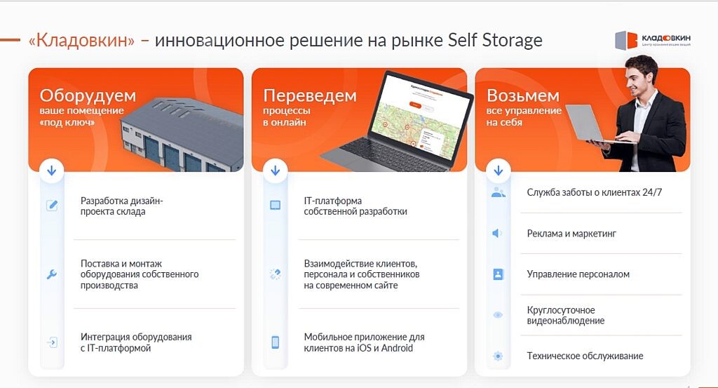 Пустующее помещение будет приносить стабильный прогнозируемый доход, а от первой прибыли собственника отделяет всего пару кликов, совершенных арендатором в мобильном приложении «Кладовкин». Схема модели партнерства прозрачна, выгодна и открыта: ✅ Мы выполняем основную работу — готовим смету и финмодель проекта, помогаем переоборудовать и спланировать помещение «под ключ», привлекаем и поддерживаем клиентов, управляем доступом, отвечаем за маркетинг и работу IT-системы. ✅ Вы обеспечиваете поддержание помещения в чистоте, оплату коммунальных услуг и доступ к интернету. Взамен получаете эффективный, автоматизированный бизнес self-storage, функционирующий автономно, без постоянного присутствия персонала. Мы знаем, о чем говорим: ✅ Прошли путь от небольшого проекта до крупнейшего игрока и технологического лидера в сегменте self-storage. ✅ 10 лет предлагаем арендаторам лучшие варианты хранения: от небольших боксов до просторных кладовок. ✅ Мы перенесли все этапы аренды склада индивиду