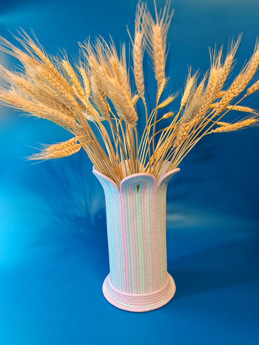 Сделала вазу из шнура для сухоцветов.