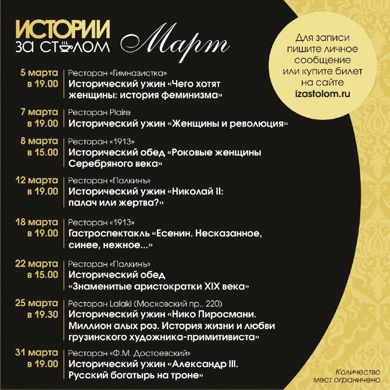 На завтра есть еще 3 места. На 8 марта мест уже нет, к сожалению. 📍Все анонсы находятся в закрепленных сообщениях. На все мероприятия можем сделать подарочный сертификат. Если есть какие-то вопросы, пишите @AnnaShuniaeva или купите билеты на сайте izastolom.ru