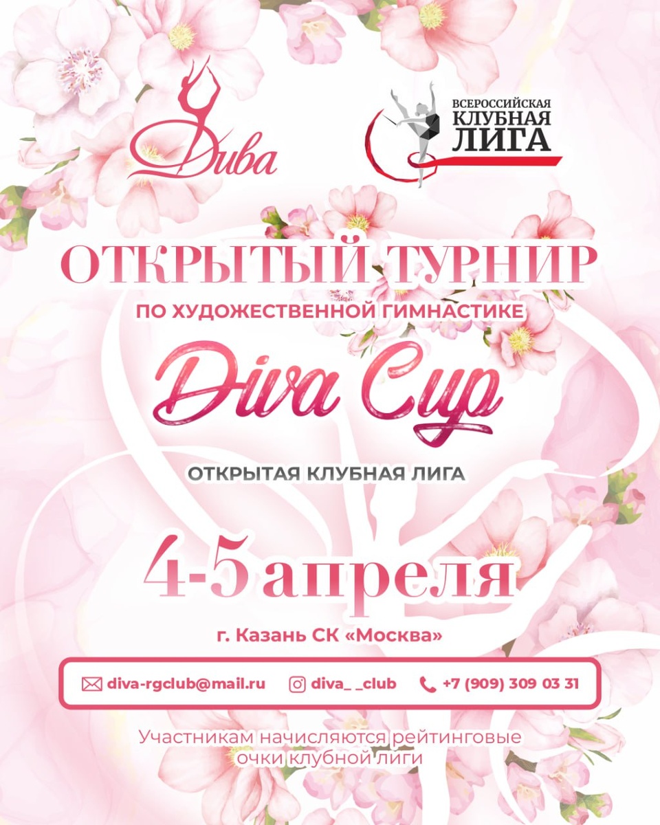 »💖🌟 Даты проведения: 4–5 апреля 2026 года 💥Место: СК «Москва», Республика Татарстан, г. Казань, ул. Московская, д. 49 ✨На турнире: — начисление рейтинговых очков Клубной Лиги🏅 — соревнования для индивидуальных гимнасток и команд — яркая спортивная атмосфера и поддержка участников🎀 ⚡️Главный судья: Исаева Дарья 📌Главный секретарь: Труфанова Марина 🔗Подробности и положение – на сайте: https://rgclubsleague.com/schedule/otkrytyy-turnir-po-khudozhestvennoy-gimnastike-quot-diva-cup-quot4093_63763/?clear_cache=Y