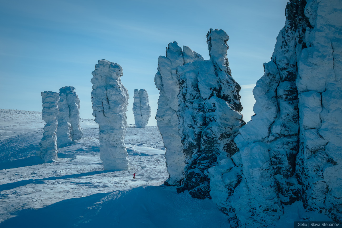 Республика Коми, Северный Урал, вокруг тайга на сотни километров. Именно здесь находится одно из семи чудес России – плато Маньпупунер. 200 миллионов лет назад это были горные вершины, но ветер, дождь и перепады температуры превратили их в 7 столбов высотой до 42 метров — сопоставимо с уровнем 14-этажного дома. Зимой каменные останцы покрываются слоем снега и льда, блестят на солнце и выглядят ещё более необычно, чем летом. Добраться до плато можно на вертолёте, снегоходе или на лыжах. 1. Маньпупунёр — одно из самых труднодоступных мест Урала, расположенное на территории Печоро-Илычский заповедник. Зимой сюда добираются в основном на вертолёте или на лыжах. 2. На плато возвышаются семь каменных останцев высотой до 42 метров. В мороз они покрываются инеем и выглядят как гигантские ледяные статуи. 3. На языке манси название плато означает «Малая гора идолов». Для коренного народа это место веками считалось священным. 4. Зимой световой день здесь короткий. Низкое солнце создаёт длинные те