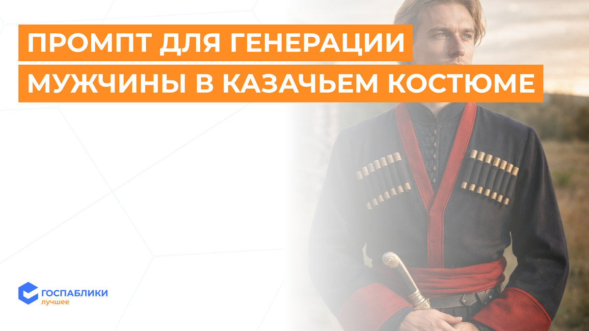 Сам промпт: Использовать загруженное фото мужчины как основной референс. Полностью сохранить лицо, черты внешности, возраст, пропорции и узнаваемость человека, без искажений и изменений. Создать фотореалистичное изображение мужчины в традиционном костюме казака: тёмный черкесский кафтан с газырями на груди, яркие контрастные элементы (красный или тёмно-синий), широкий пояс, сапоги, возможна шашка в ножнах. Образ должен выглядеть аутентично и исторически правдоподобно. Поза — уверенная, статная, в полный рост или по пояс, с прямой осанкой, спокойное и уверенное выражение лица. Фон — природный или исторический: степь, деревянные постройки, тёплый закатный свет или нейтральный естественный фон. Освещение — мягкое, естественное, с кинематографичным объёмом, подчёркивающее текстуры ткани и детали костюма. Стиль — фотореализм, высокая детализация, натуральные цвета кожи, чёткий фокус, профессиональная съёмка, без стилизации под рисунок. Сохранить естественность лица и интеграцию в образ без