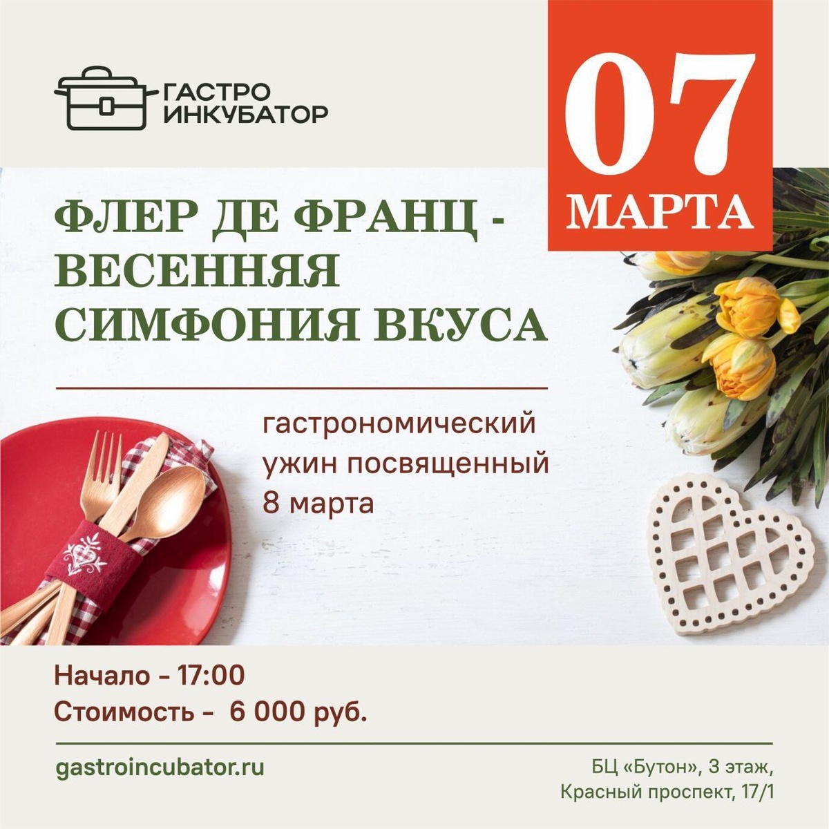 " 💐 💫Приглашаем вас на изысканный гастроужин, посвященный празднованию 8 марта. 🍽️ Меню ужина 1. Amuse buche Креветочный коктель с тропическими фруктами 2. Холодная закуска Утиное магре с облепиховым винегретом 3. Сорбет из ягод 4. Основное блюдо Surf & Turf ( пара - говядина/палтус) 5. Десерт Ромовая баба Алкогольное сопровождение..Игристое брют, красное и белое вино. 📍 Адрес: Красный проспект 17/1, 3-й этаж Дата мероприятия - 0️⃣7️⃣ марта Начало ужина: 17:00 Записаться по номеру +7913 916 98 82 +7913 007 68 78