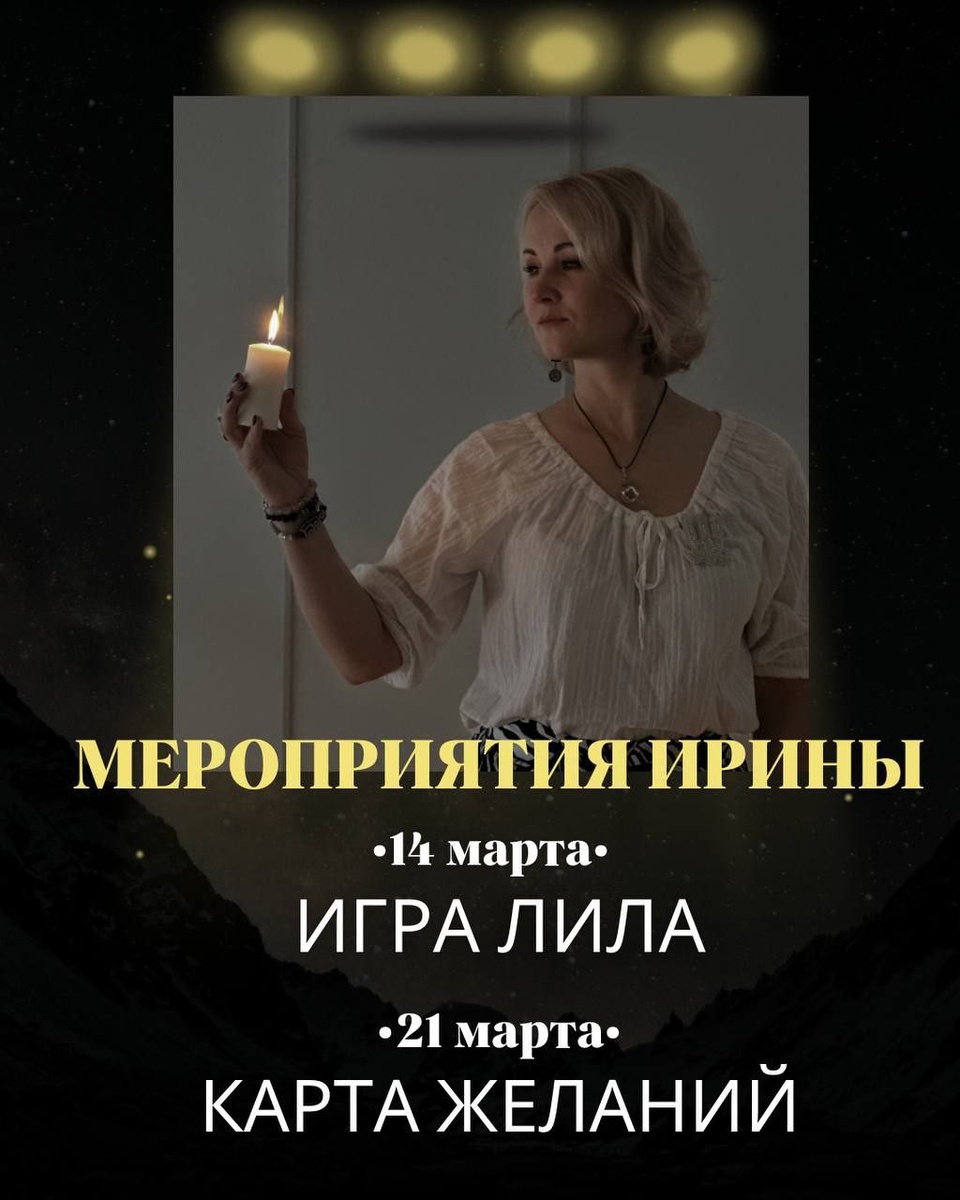 ✨ ⠀ Приглашаем вас на особенную встречу — игру «Лила» в авторском формате Ирины. ⠀ Лила с Ириной – это глубокая практика самопознания, где через игровое поле, символы и ваш личный запрос открываются важные для вас ответы и знания. ⠀ 🔥 В чём уникальность Лилы с Ириной: — бережное и точное сопровождение каждого участника; — умение увидеть корень ситуации, а не только её внешние проявления; — соединение информации из потока и живой энергии поля; — создание безопасного пространства ⠀ 🔮 Что вы получите: — ясность по своему запросу; — понимание дальнейших шагов и действий; — освобождение от внутренних ограничений; — мощные инсайты и ощущение внутреннего сдвига. ⠀ «Лила» показывает, где вы находитесь сейчас и какие решения приведут к новому уровню. ⠀ ✨Если вы чувствуете, что застряли, стоите перед выбором или готовы к новому этапу — Лила ждёт вас! ⠀ ✨ Возможно, это именно та встреча, которая изменит ваш вектор. ______________________________________ ⠀ ✨ 21 марта | Тренинг «Карта Желаний»