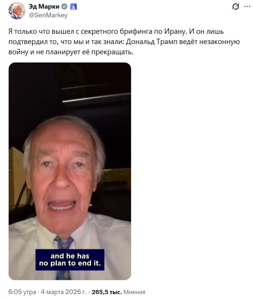 Cенатор-демократ от Массачусетса Эд Марки заявил после секретного сенатского брифинга по Ирану, что у Трампа нет плана, как закончить войну.