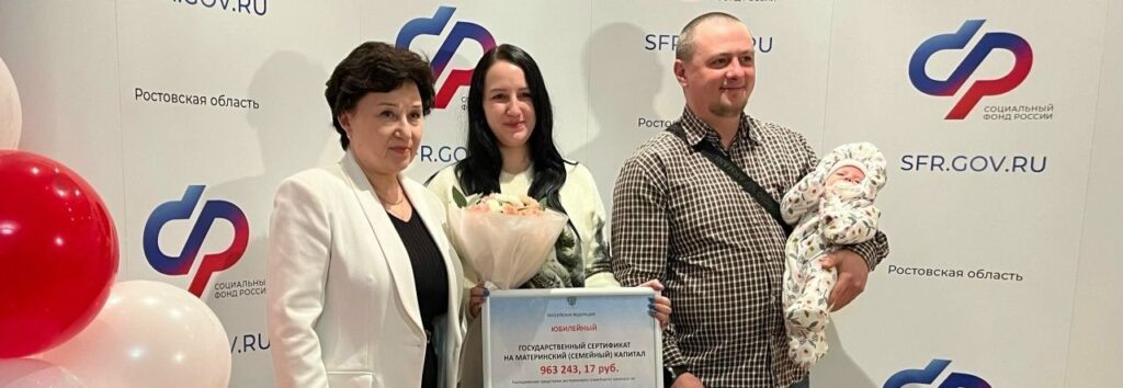 В преддверии Международного женского дня в отделении СФР по Ростовской области прошло торжественное вручение 450-тысячного сертификата на материнский капитал, выданного в регионе с момента запуска программы. Юбилейный сертификат получила мама месячной Дианы из Ростова-на-Дону, вручение провела управляющий отделением Светлана Жинкина. Программа материнского капитала является одной из ключевых мер поддержки семей в Ростовской области. С 2020 года сертификаты оформляются автоматически на основании данных из ЗАГС. В прошлом году в таком формате материнский капитал получили 16 531 мама, а с начала 2026 года — уже 2366 женщин. Средства материнского капитала можно использовать для улучшения жилищных условий, ежемесячных выплат, образования детей, реабилитации детей-инвалидов, накопительной пенсии, а также получить единовременную выплату остатка до 10 тысяч рублей. Владелица юбилейного сертификата Анастасия планирует направить деньги на расширение жилплощади. Программа действует в России с 1 я