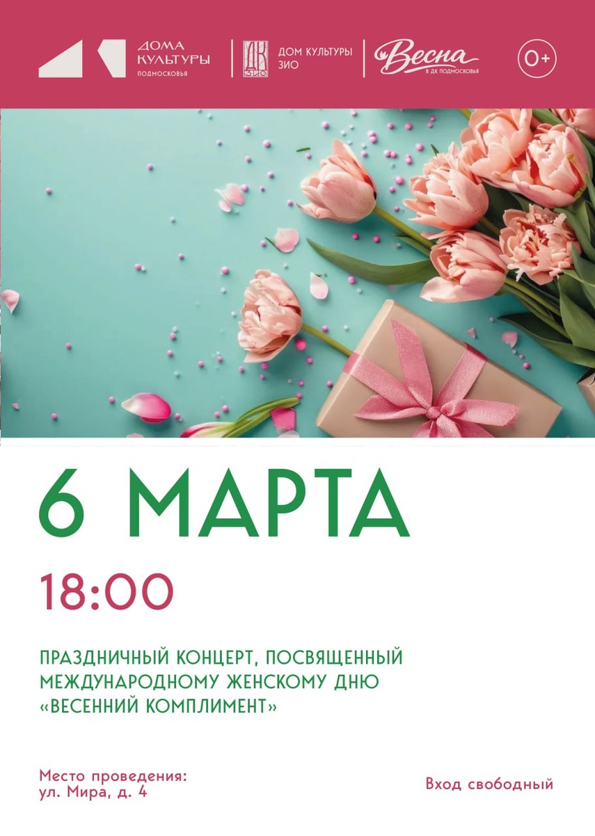 »! 6 марта в 18:00 в Доме культуры ЗИО состоится концерт, посвящённый Международному женскому дню. В этот вечер для прекрасной половины человечества прозвучат самые тёплые слова и музыкальные поздравления. ✨ В программе: яркие вокальные номера, зажигательные танцы и искренние поздравления 🎭 Лучшие творческие коллективы подарят своё искусство зрителям 🌟 Приглашённые гости вечера: • Образцовый театр моды «Эксклюзив» • Хореографическая студия «Юлион» • Студия танца «Экситон» • Екатерина Немкович (МУДО «Ровесник») • Хореографический коллектив «Колорит» Ждём всех, кто хочет разделить радость праздника и получить заряд весеннего настроения! 🌷 Вход свободный. #ДКЗИО #ВесеннийКомплимент #8Марта #Концерт #Подольск #ПраздникДляЖенщин