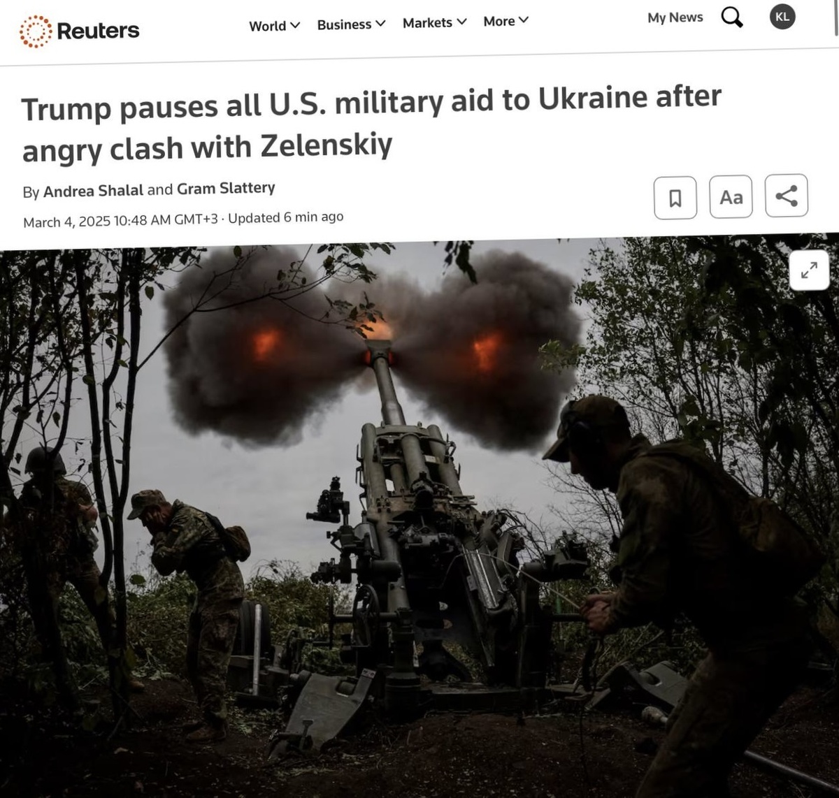 REUTERS: ПОСТАВКИ ВОЕННОЙ ПОМОЩИ КИЕВУ ОТ США ПРЕКРАТИЛСИЬ В РАЙОНЕ 4:30 УТРА