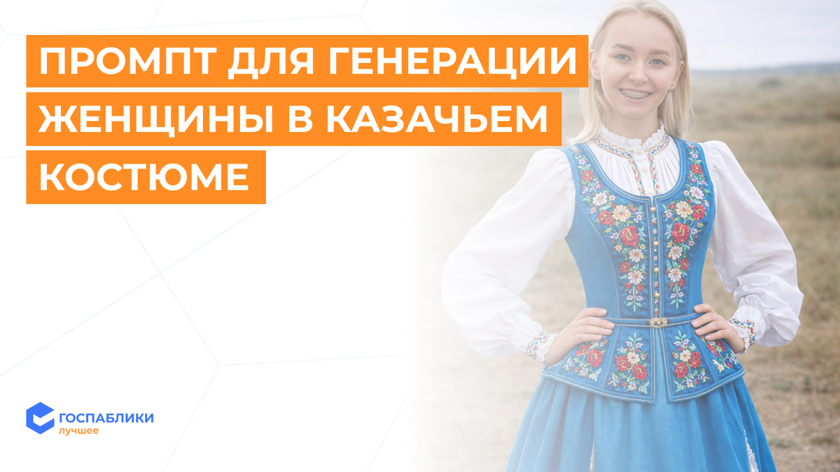 Сам промпт: Использовать загруженное фото женщины как основной референс. Полностью сохранить лицо, черты внешности, возраст, пропорции и узнаваемость, без искажений и изменений. Одеть женщину в традиционный казачий женский костюм, строго соответствующий референсу: длинное ярко-голубое платье с приталенным жилетом-корсетом, богато украшенным цветочной вышивкой, белая блуза с длинными объёмными рукавами, многослойная юбка с декоративными вставками и узорами по нижнему краю. Все элементы костюма должны точно повторять форму, цвет, орнамент и структуру ткани, как на примере. Поза — естественная и уверенная, в полный рост, с прямой осанкой, руки могут быть на поясе или в спокойном положении. Фон — природный или нейтральный (степь, мягкий свет, либо светлый студийный фон), без перегрузки деталями. Освещение — мягкое, естественное, с хорошей проработкой текстур ткани и вышивки. Стиль — фотореализм, высокая детализация, чёткий фокус, натуральные цвета кожи, профессиональная съёмка. Сохранить е