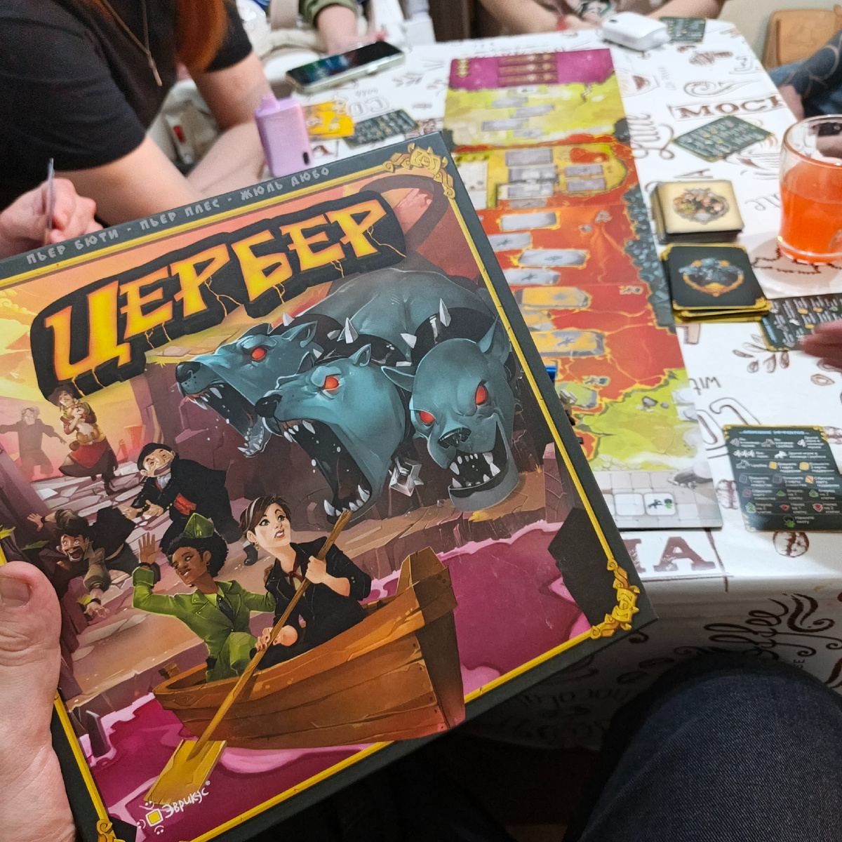 ⏺ Команда Цербера. Рано или поздно жуткая псина кого-то догонит... Но это не конец игры! Теперь этот игрок играет за команду Цербера и пытается поймать всех остальных. Только в этом случае он победит. В целом, в команде Цербера побеждают все, кроме двух последних пойманных. Бедолаги... Так вот, когда человек переходит в другую команду, он переворачивает свои основные карты на другую сторону, и теперь они являются картами Цербера. Карты поддержки сбрасываются и становятся картами коварства. Геймплей особо не меняется со сменой сторон, кроме как то, что теперь в команде Цербера вас ждет самая сплоченная и дружелюбная компания в этой игре, которая вас не предаст (парадоксально, да?). Ну и ещё теперь вы управляете одной общей фигуркой.