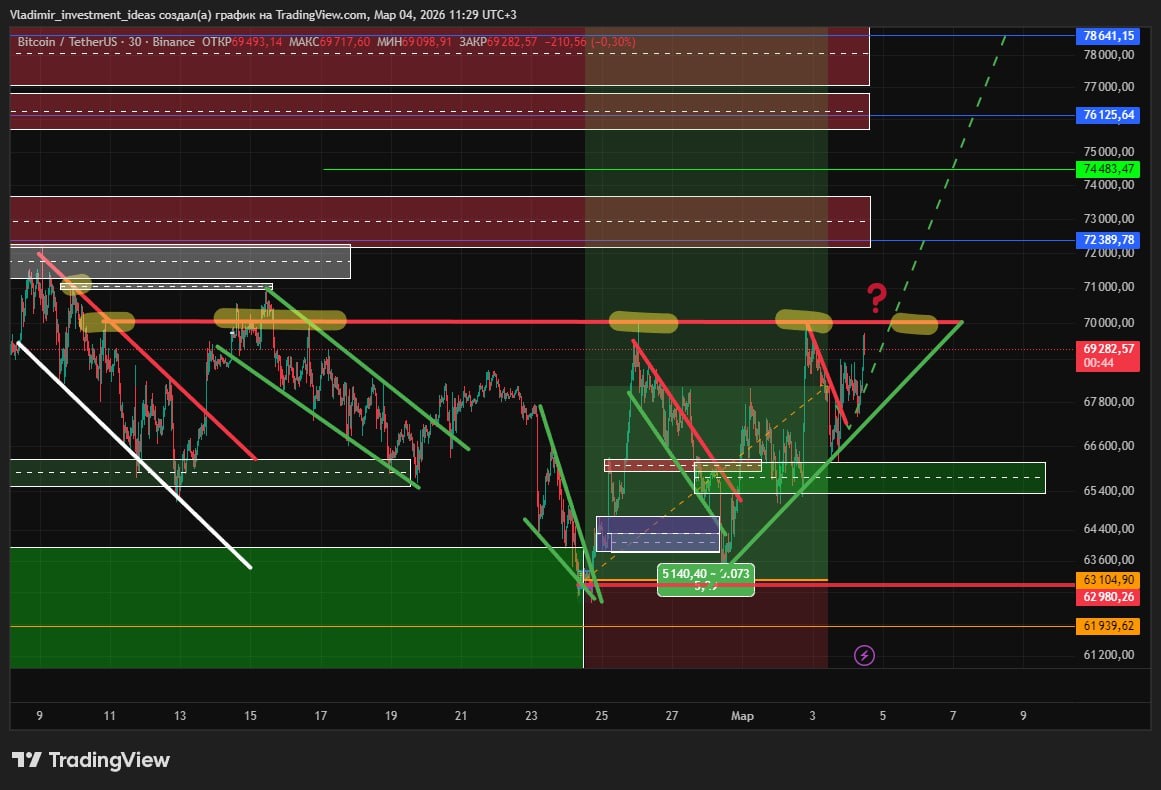 #BTC тут сопротивление на уровне 70000$ как пробьем так и полетим выше, напоминаю я жду цену в район 72000 минимум, а далее 74 и 84000, там будем смотреть дальше по ситуации