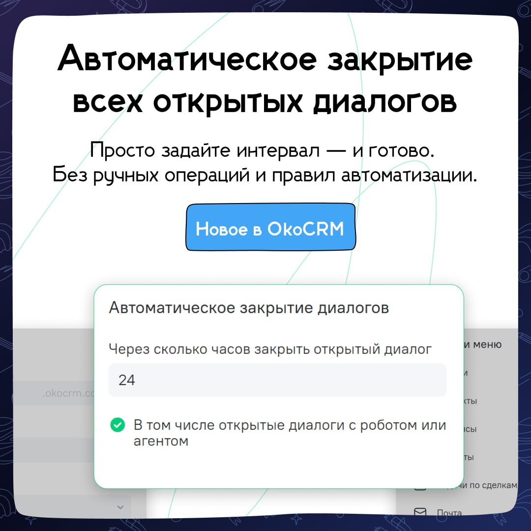 🥧Горячий пирожок в OkoCRM: автоматическое закрытие всех диалогов. Новая фича полезна для всех, кто использует роботов и AI-агентов. ❌ В чем проблема: если диалог остаётся открытым, CRM думает, что разговор с клиентом ещё идёт. Если клиент пишет повторно ➡️ робот или ИИ-агент не запускаются ➡️ диалог зависает без ответа, пока менеджер не зайдёт и не напишет вручную. Раньше было два варианта: 🔘закрывать каждый диалог вручную 🔘или использовать правило автоматизации — и закрывать диалоги по событию. ✔️ Теперь всё проще: в общих настройках можно просто задать интервал, через сколько диалоги должны быть закрыты — и настройка применится сразу для всех диалогов в Чатах. Пользуйтесь 👌