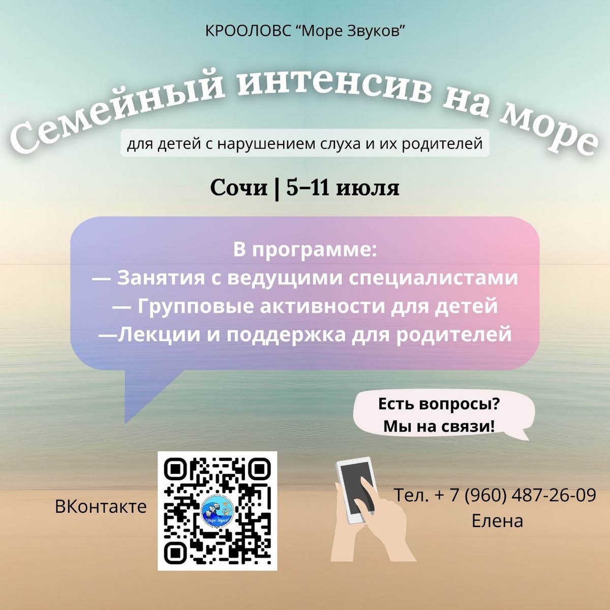 Приглашаются семьи с детьми, имеющими нарушения слуха и речи. Что вас ждет: 🏖 Отдых на море для всей семьи 👩⚕️ Занятия с высококвалифицированными специалистами 🎯 Насыщенная реабилитационная программа Не упустите шанс совместить приятное с полезным! 🗓 Запись по телефону: 8-960-487-26-09 (Елена)