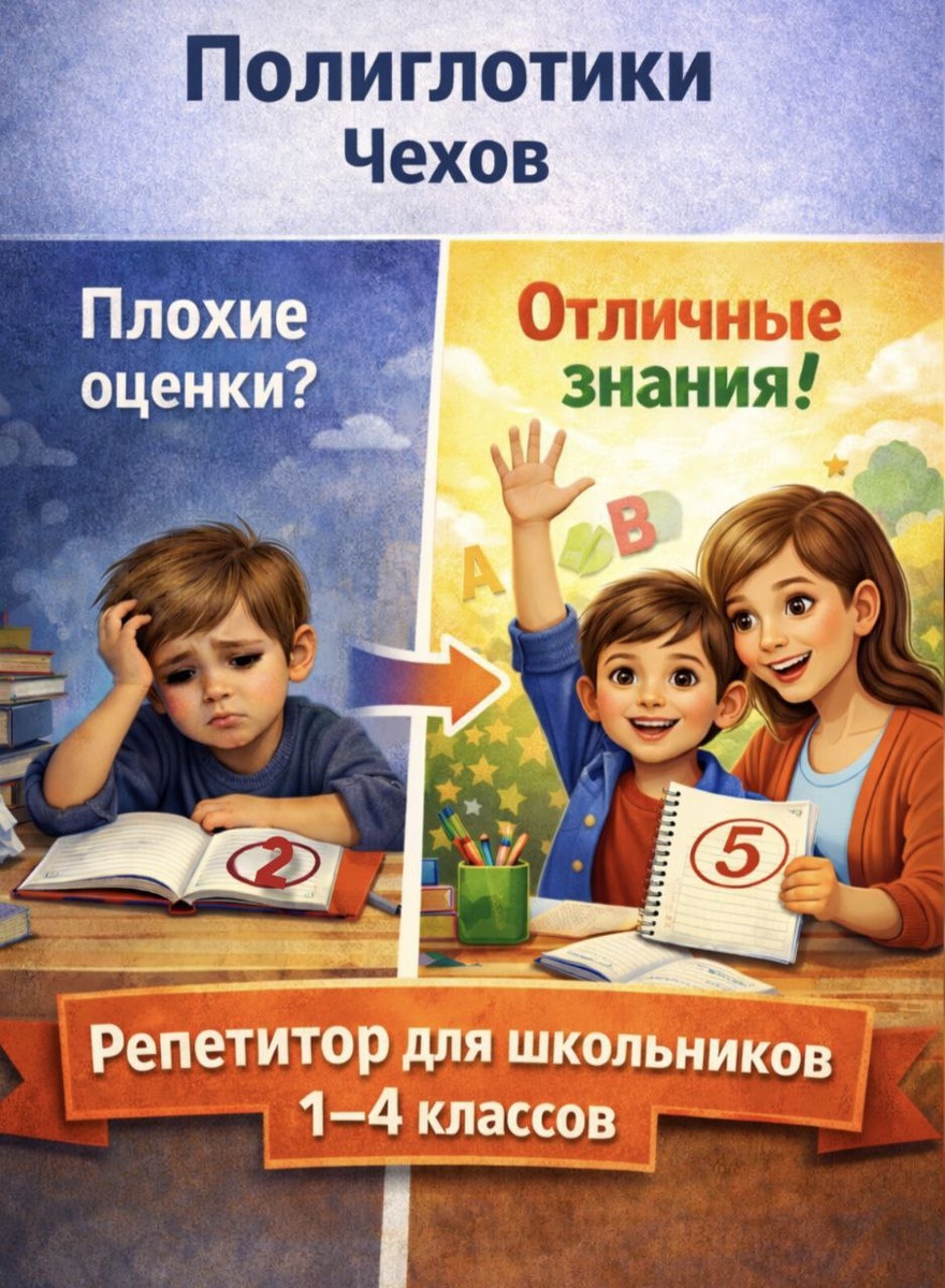 Приглашаем учеников начальной школы на индивидуальные занятия в центр «Полиглотики» ✨ Помогаем уверенно разобраться в программе и повысить успеваемость без стресса 💛 🎯 ЗАНЯТИЯ ПОДОЙДУТ, ЕСЛИ: 🔹 Возникают трудности с домашними заданиями 📖 🔹 Есть пробелы в знаниях 🔹 Снизилась успеваемость 📉 🔹 Ребёнок знает предмет хорошо, но нужна систематизация и более глубокое понимание 📝 О ЗАНЯТИЯХ: ▫️ Для школьников 1–4 классов ▫️ Индивидуальный формат 👩🏫 ▫️ Подбираем удобное расписание ▫️ Педагог с опытом работы в школе ▫️ Спокойная и поддерживающая атмосфера 💰 Стоимость: 45 минут — 1100 рублей 📲 Записаться и получить консультацию: ✅ 8 (964) 566-37-96 (звонок, Telegram) 📍 г. Чехов, ул. Уездная, д. 2