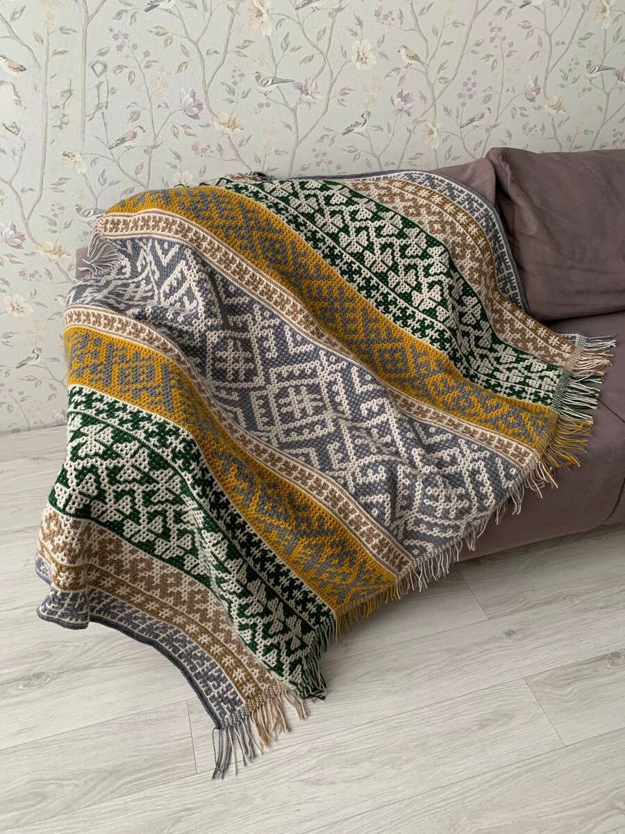 Елена: «Мой плед: примерно 140/170, карачаевская двухнитка, все узоры из книги «Самый родной узор».