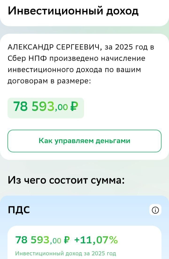 1. Инвестиционная доходность за 2025 год по двум моим договорам ПДС в НПФ Сбербанка составила 11,07% годовых. Начислено 78 593 руб. В 2024-2025 гг. внес добровольные взносы 194 000 руб и перевел накопительную часть пенсии 714 420,88 руб. На данный момент суммарный объем средств в ПДС - 1 004 961 руб. Вся история на картинках. 2. В феврале замминистра финансов Иван Чебесков заявил, что Минфин планирует увеличить срок снятия средств софинансирования ПДС до 5 лет. Считаю этот шаг логичным и предсказуемым. Продолжу делать ежегодные взносы как себе, так и маме. ✏️Все детали и нюансы ПДС я раскрыл в статье на сайте: https://asdorzhiev.ru/2025/12/25/pds-2025/ ✏️Личный и семейный опыт здесь: https://asdorzhiev.ru/2025/12/25/my_pds/ Под хэштегом #ПДС на канале собраны все материалы о программе долгосрочных сбережений с 2024 года. Никакой материальной выгоды от вашего участия или неучастия в ПДС не имею. 📱 Александр Доржиев