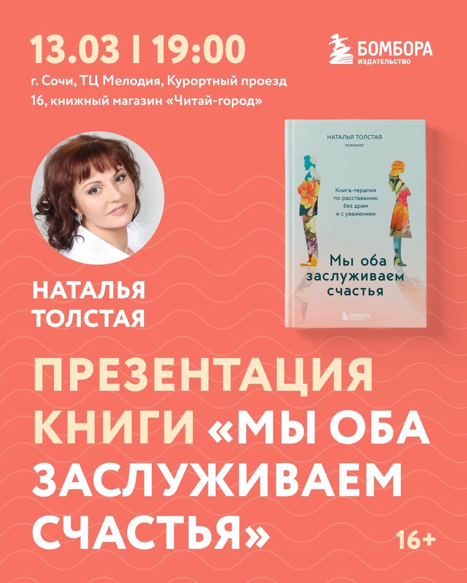 13 марта в 19:00 состоится презентация книги «Мы оба заслуживаем счастья. Книга-терапия по расставанию без драм и с уважением». Вы строили отношения, мечтали о счастье, вкладывали силы, но в один момент все оказалось в руинах. Вы или ваш партнер поняли: быть вместе больше невозможно. И теперь перед вами стоит сложнейший вопрос: как расстаться так, чтобы сохранить человеческое достоинство, не превратить разрыв в поле битвы и не разрушить себя? Книга посвящена теме расставания и развода — сложному этапу, который требует не только эмоциональной устойчивости, но и внутренней зрелости. Когда: 13 марта, 19:00. Где: Сочи, ТЦ «Мелодия» (Курортный пр., 16), 3‑й этаж, книжный магазин «Читай‑город». Приходите за хорошим настроением! Буду рада всех видеть. Поговорим, обнимемся, сфотографируемся! Вход свободный!