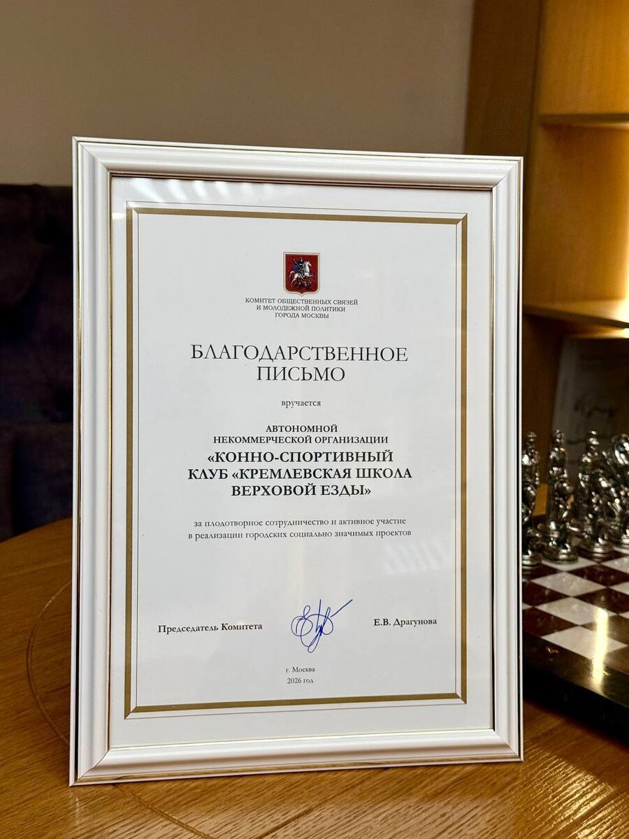общественных связей и молодежной политики города Москвы, Кремлевская школа верховой езды получила благодарность за плодотворное сотрудничество и активное участие в реализации городских социально значимых проектов. Комитет общественных связей и молодежной политики города Москвы — орган исполнительной власти города Москвы, деятельность которого направлена на создание совместных проектов, поддержку социально ориентированных некоммерческих организаций, а также поощрение молодежных инициатив. Мы рады быть частью большого сообщества единомышленников, вносить вклад в развитие Москвы, бережно сохранять её историческое наследие и продолжать эффективное сотрудничество на благо столицы.