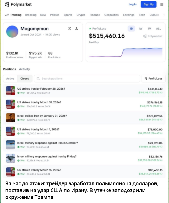 Есть такая старая трейдерская поговорка: «Покупай на слухах, продавай на фактах». Но что, если слухи доступны не всем, а только тем, кто сидит в нужных кабинетах? В ночь на 28 февраля, когда мир еще не знал, что через несколько часов по Тегерану ударят ракеты, на платформе Polymarket происходило нечто странное. Аккаунты, созданные за несколько дней до атаки, одна за другой грузили десятки тысяч долларов на победу с вероятностью 17%. Когда новость об ударе разлетелась по СМИ, эти люди проснулись миллионерами. Общий выигрыш шести подозрительных аккаунтов — $1,2 млн. А один особенно удачливый трейдер под ником Magamyman заработал $515 000 за сутки . Совпадение? В мире финансов это называется инсайдерской торговлей. И по законам большинства стран за это сажают в тюрьму. Но есть одна пикантная деталь: сын президента США Дональд Трамп-младший входит в консультативный совет платформы Polymarket . И это не первый раз, когда окружение Трампа каким-то мистическим образом оказывается в нужном ме