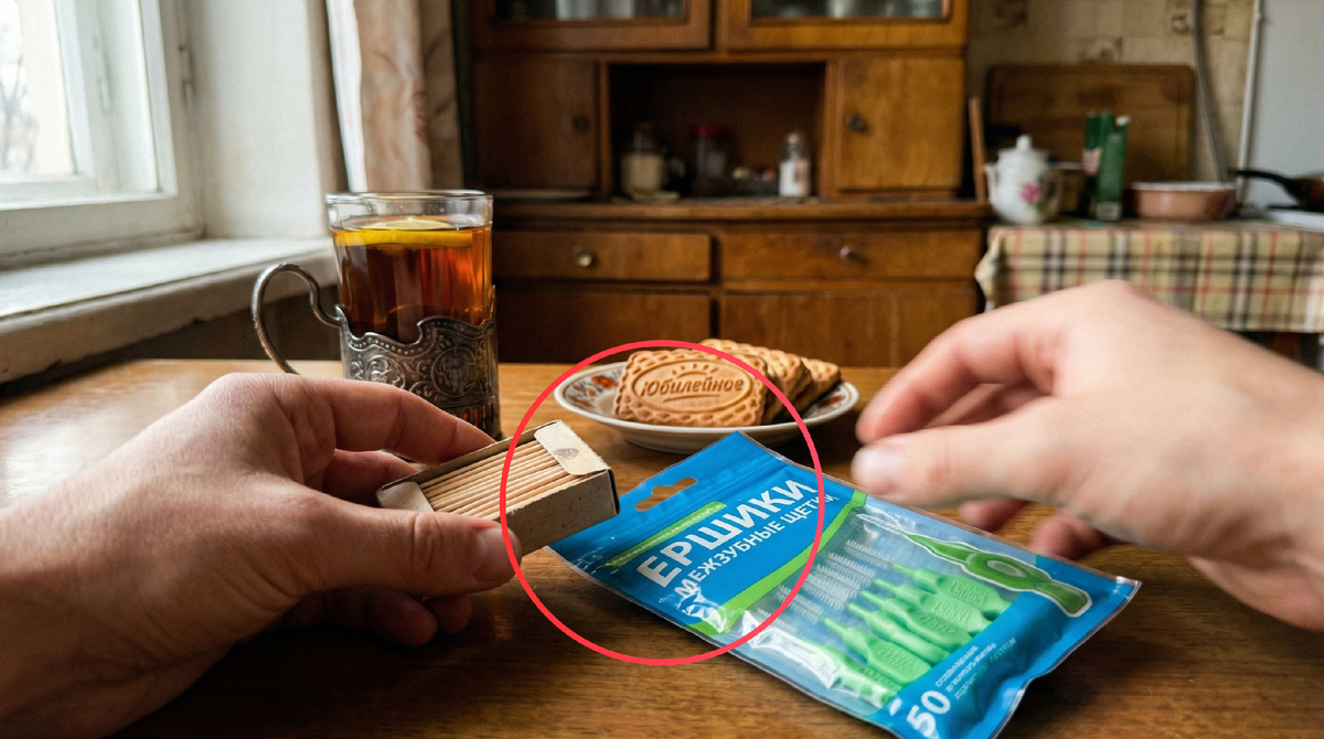 Видели эти стаканчики на столиках в кафе? Там обычно стоят деревянные палочки в индивидуальных обертках. Поели мясо - и рука сама тянется. Кажется, что это гигиена. На деле всё проще: это самый короткий путь к потере зуба. Смотрите, в чем тут дело. Я в стоматологии уже больше 20 лет. И когда вижу, как кто-то из близких начинает ковыряться в зубах этой щепкой, у меня буквально внутри всё переворачивается. Это не вредность. Это страх за ваше здоровье. Между нашими зубами есть крошечный, но важный орган - десневой сосочек. Он как мягкая пробка закрывает пространство, чтобы там ничего не гнило. После 45 лет эта ткань становится капризной. Она уже не такая упругая, как в 20 лет. Зубочистка работает как грубый клин. Вы пытаетесь достать кусочек шашлыка, а вместо этого вонзаете дерево в живое. Что происходит потом? Кстати, забыл сказать. Дерево - это пористый материал. Пока палочка стоит на столе, она впитывает в себя всё: пыль, чужое дыхание, кухонные испарения. И вы этот "букет" добровольно