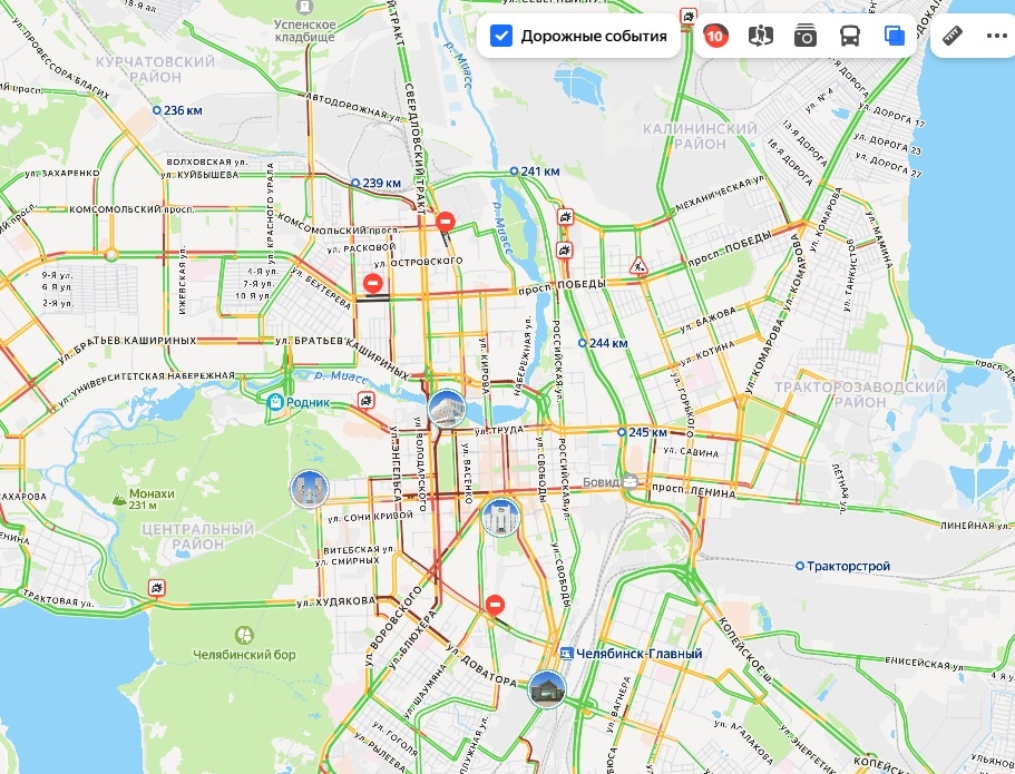 Сразу несколько аварий в разных районах осложнили дорожную обстановку. Утром 4 марта в Челябинске собрались заторы на 9 баллов, а вечером они достигли уже 10 баллов. Согласно данным онлайн-карт сервиса «ЯндексПробки», крайне сложно сейчас передвигаться по центру: темно-красными остаются Свердловский проспект, проспект Ленина, улицы Блюхера, Доватора, Худякова, часть улицы Курчатова, Энгельса, Татьяничевой, Образцова, Цвиллинга, Свободы, Российской. Также на онлайн-картах появилась россыпь значков, означающих ДТП. Сразу два таковых размещены на центральном участке улицы Труда – в районе ДС «Юность» и «Западного луча». Также аварии, согласно картам, произошли на улице Кирова, на автодороге «Меридиан», на развилке на улице Худякова перед развилкой у Шершневской плотины, на перекрестке улиц Героев Танкограда и Северного луча, а также у пересечения Свердловского тракта и улицы Черкасская. Добавим, что сегодня в Челябинске весь день идет снег и пока прекращаться осадки не собираются. Уборка