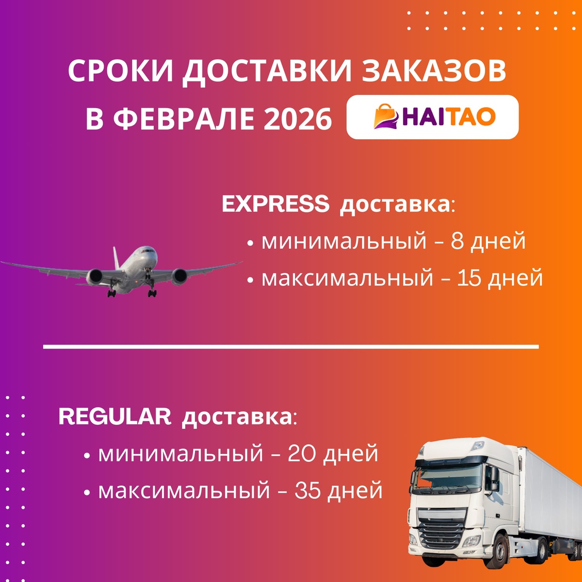 Чтобы вы могли спланировать закупки заранее: ✈️ EXPRESS доставка 🚛 REGULAR доставка 📩 Хотите рассчитать точный срок и стоимость доставки? Напишите нам в Direct — менеджер HaiTao подберёт оптимальный вариант именно для вас. Сервис HaiTao — доставляем быстро, понятно и надёжно 🧡 #логистикаКитай #карго #авиадоставка #белаядоставка #закупкивКитае
