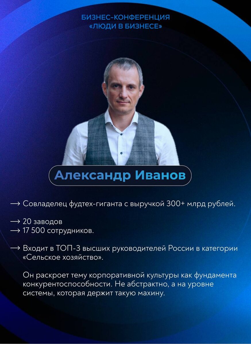 Между стратегией и «текучкой». Между доверием партнёру и тотальным контролем. Между желанием масштабироваться и страхом, что всё рухнет. 27–28 марта мы собираемся в Москве на конференции «Люди в бизнесе», чтобы наконец перестать латать дыры и начать строить систему, которая работает на вас 🧩 В карусели — карточки спикеров, каждый из которых закрывает критическую зону в жизни компании. Программа выстроена так, чтобы вы получили комплексное решение: 2️⃣ Про фундамент и культуру. Александр Иванов (ЭФКО) раскроет тему корпоративной культуры не как «мотивации», а как жесткой системы, которая позволяет управлять 20 заводами и 17 500 сотрудниками с выручкой 300+ млрд рублей. 4️⃣ Про безопасность и союзы. Дмитрий Гриц разберёт тему партнёрства. Как на берегу договориться так, чтобы союз усиливал бизнес, а не превращался в стратегическую ошибку. 1️⃣ Про деньги и соавторство. Вместе с Диной Фроловой выясним, кто такой финдиректор: просто контролёр или ваш прямой партнёр по прибыли. 5️⃣ П