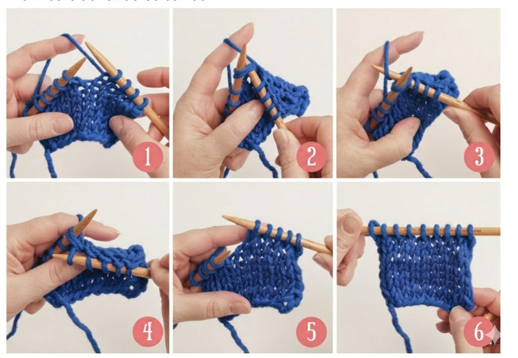 Этот урок описывает самый простой и распространенный способ убавок — провязывание двух петель вместе лицевой с наклоном вправо (k2tog). Если вы хотите придать форму вашему изделию — например, сформировать пройму, вырез горловины или приталить модель — это можно сделать с помощью простых убавок. Когда вы делаете убавки рядом с маркерами или кромочными петлями, с лицевой стороны это выполняется так: Рисунок 1: Вяжите до того места, где нужно сделать убавку. На фото показан пример убавки рядом с 4-мя крайними петлями. Рисунок 2: Введите правую спицу в следующие 2 петли на левой спице так, как если бы вы собирались вязать лицевую. Вводите спицу слева направо: сначала во вторую петлю, а затем в первую петлю на левой спице. Рисунок 3: Накиньте рабочую нить на кончик правой спицы (как при обычном вязании лицевой) и протяните нить через обе петли сразу. Теперь на правой спице у вас появилась одна новая петля. Рисунок 4: Сбросьте обе старые петли с левой спицы. Эти две петли теперь провязаны