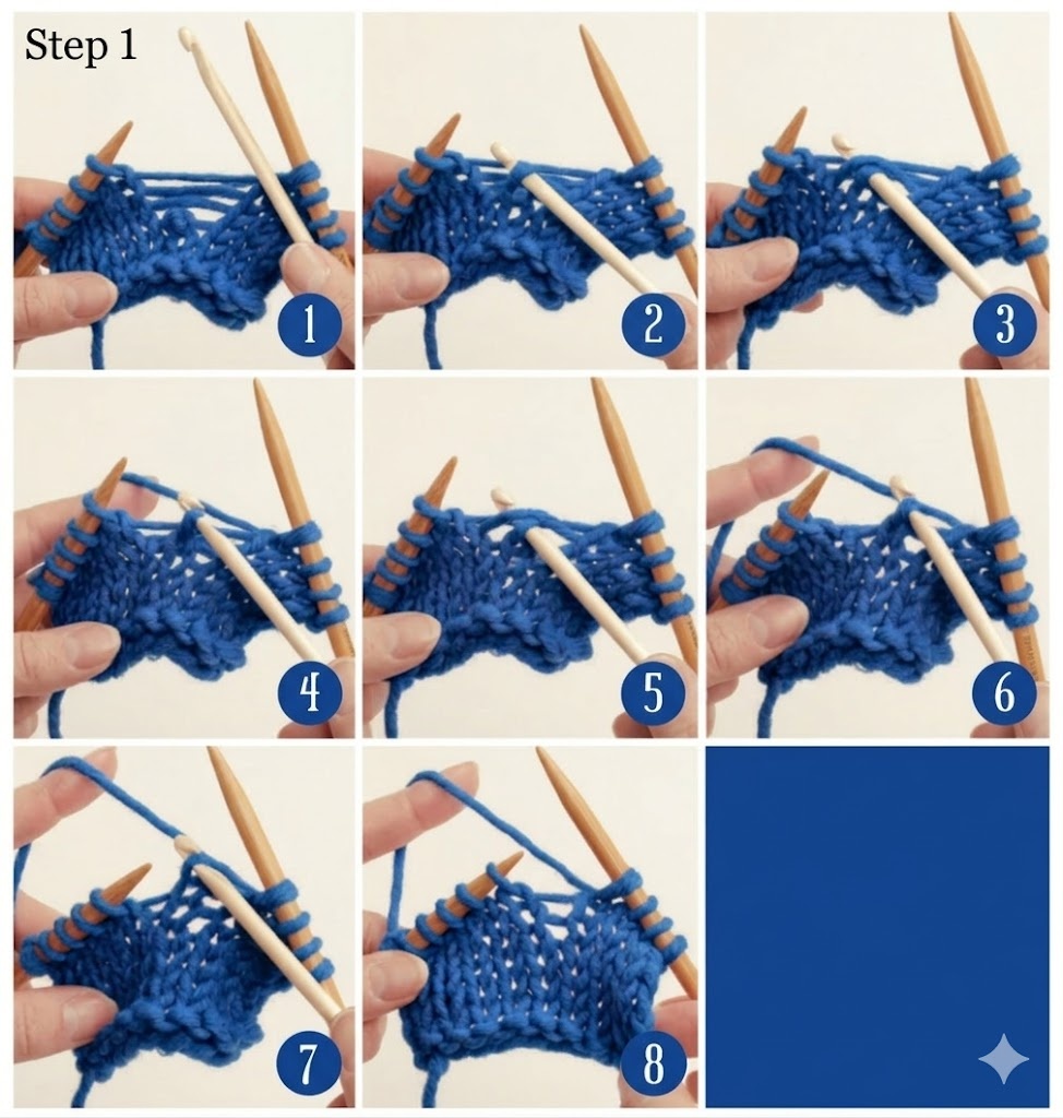Этот урок — логическое продолжение предыдущего 9 урока. Если петля «убежала» далеко вниз, спицами орудовать неудобно. На помощь приходит вязальный крючок. В работе с такой пряжей, как DROPS Air (она пушистая), важно поймать петлю как можно быстрее, пока ворсинки не спутались. Если при вязании лицевой глади вы уронили петлю, и она распустилась на несколько рядов вниз — не паникуйте. Мы покажем, как легко вернуть её на место и продолжить работу. Рис. 1: Петля соскочила и распустилась на несколько рядов вниз. Для исправления этой ошибки лучше всего воспользоваться вязальным крючком. Рис. 2: Введите головку крючка в саму открытую петлю, которая находится внизу «дорожки». Рис. 3: С помощью крючка подхватите первую (самую нижнюю) свободную нить (протяжку), которая находится за петлей. Рис. 4: Протяните эту нить через петлю. Таким образом, вы восстановили один ряд. Рис. 5: Снова подхватите следующую свободную нить, которая находится за вашей новой петлей. Рис. 6: Протяните её через петлю — г